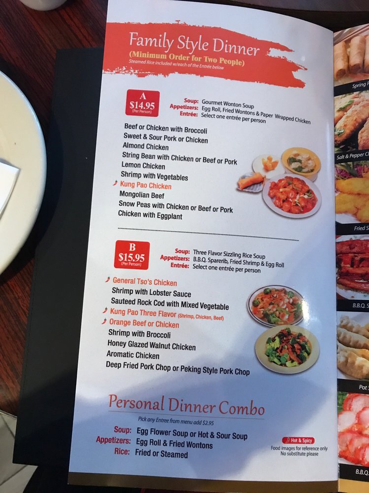 Includes soup: three flavor sizzling rice soup; appetizers: bbq sparerib, fried shrimp & egg roll; entrée: select one entrée per person.